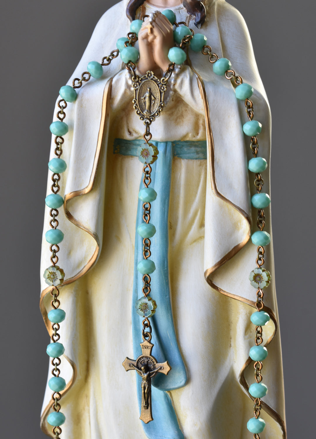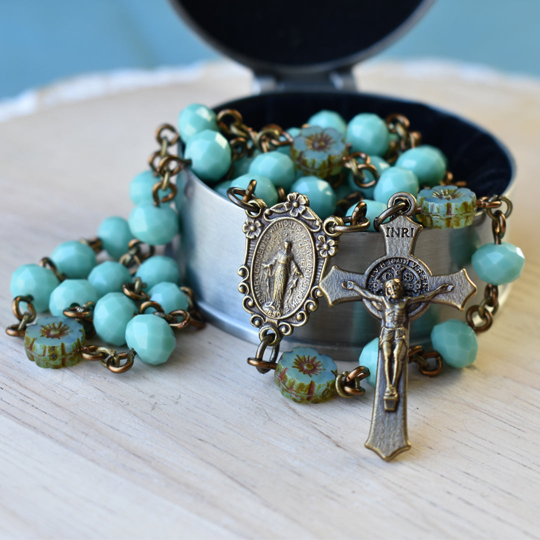 Pray the Rosary daily. So feminine and beautiful, this Rosary is designed around gorgeous floral Pater beads. From the Czech Republic, these beads are cut glass hibiscus flowers… aqua blue opaline glass with a Picasso finish. The Hail Mary beads coordinate beautifully with their opaque aqua color and are faceted, catching the light for a lovely sparkle. Pairing perfectly are the vintage bronze centerpiece and crucifix, both die-cast in Italy with amazing detail. The bronze metal enhances the Picasso finish of the floral Pater beads. The Miraculous Medal centerpiece is so feminine with floral and scrollwork details, while the crucifix features refined, flared edges with the St. Benedict medal imagery at the center of the crossbeams behind Jesus, and on the back side of the crucifix.