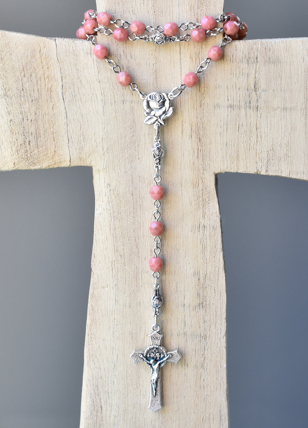 Pray the Rosary daily. Dainty and feminine, this Rosary is designed with a beautiful rose centerpiece and coordinating rosette Pater beads. The thornless rose, an iconic symbol associated with Mary, signifies her pure and sinless soul and her devotion to God. Both the centerpiece and the Pater beads, as well as the crucifix, are all die-cast and silver oxidized in Italy with exquisite detail. The centerpiece features Our Lady of Grace on the back side and the crucifix features the Miraculous Medal at its center. The Hail Mary beads are gorgeous, faceted, fire-polished glass beads with a rich, blush color. The facets of the beads add a delicate sparkle as the light dances across them. A gorgeous Rosary any lady would love!