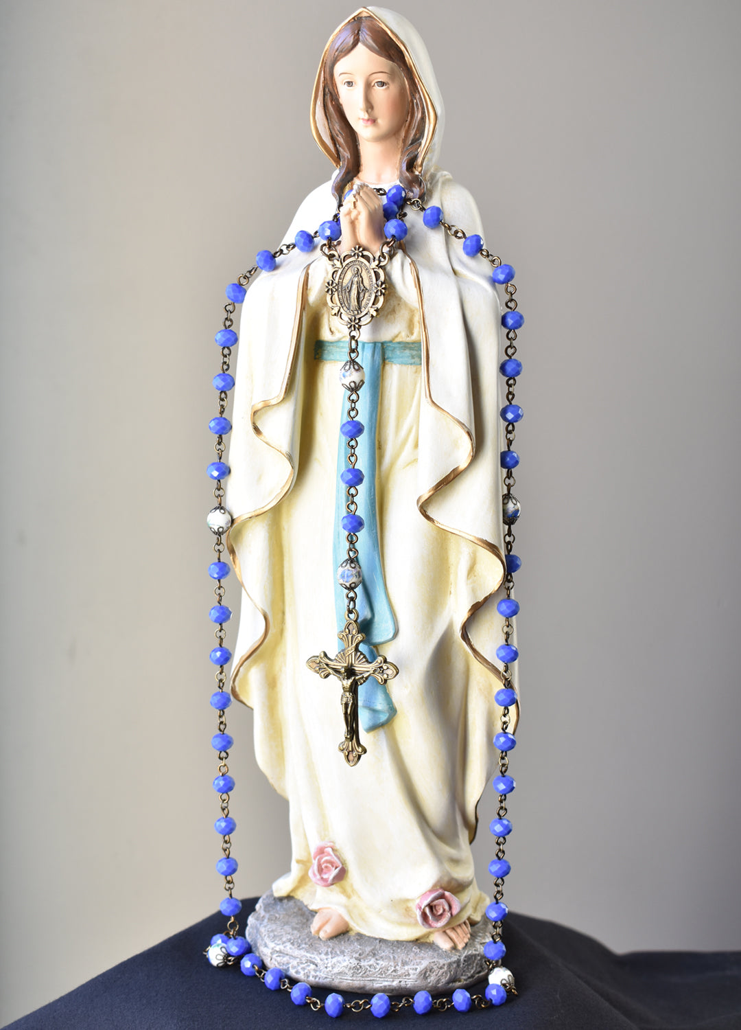 Pray the Rosary daily. This Rosary is stunning with its deep, vivid blue Hail Mary beads paired with the warmth of the vintage bronze hardware. The saturation of color in the blue, glass beads along with their facets, make them absolutely gorgeous as light dances across them. Perfectly paired, are the Our Father beads – white ceramic beads with blue flowers – and adorned with lovely and delicate bronze bead caps. Both the centerpiece and crucifix are die-cast in Italy with amazing detail. The Miraculous Medal centerpiece is exquisitely detailed with floral details and a scalloped edge, while the crucifix features flared edges, scrolls and a beautiful sunburst effect behind the crossbeams.