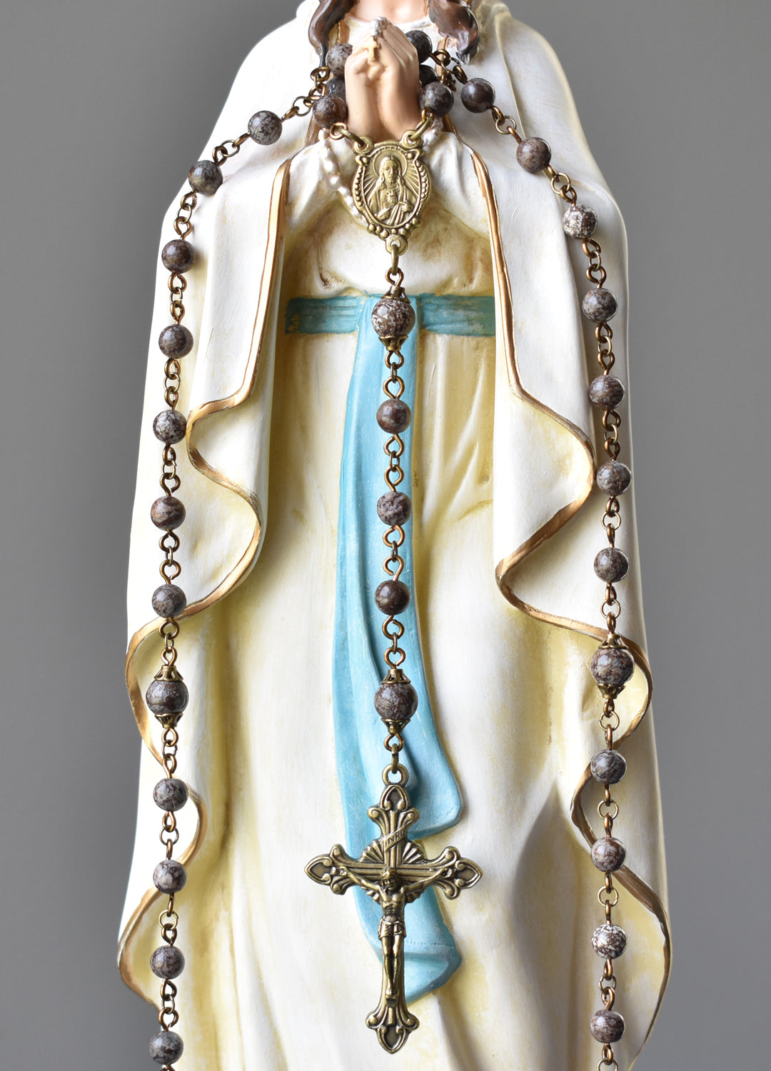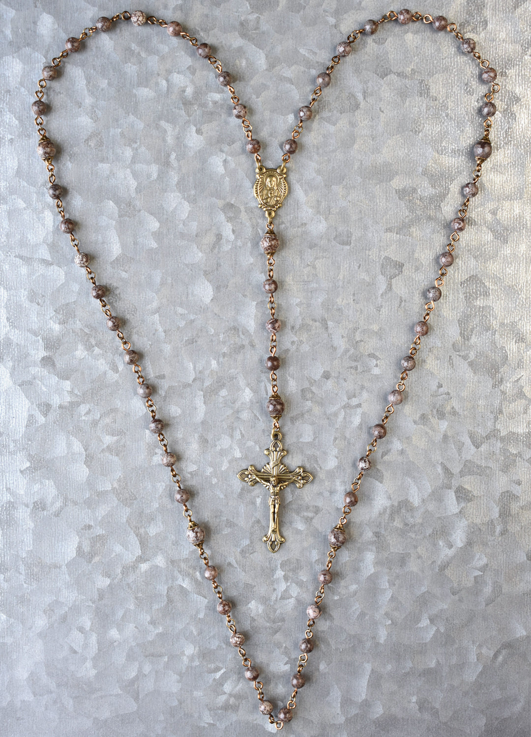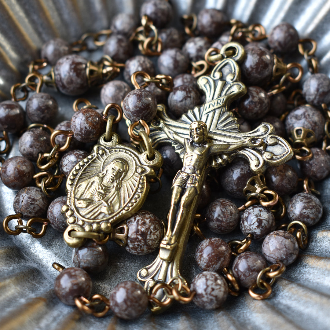 Pray the Rosary daily. Traditional, natural, refined. This Rosary is designed with natural, brown snowflake jasper beads and vintage bronze hardware. The jasper beads are an earthy brown color with greyish-white patterning throughout, and no two beads are the same (just as snowflakes… hence the name, Snowflake Jasper). The Our Father beads are set apart in size and with simple, vintage bronze bead caps. Made in Italy, the vintage bronze centerpiece features an image of the Sacred Heart of Jesus, a reminder of His eternal love for us. On the reverse is the Holy Family, another special reminder that the Catholic Church is a family united by God and His only Son through the Immaculate Conception of Mary and with the faith and love of Joseph. The vintage bronze crucifix, also made in Italy, coordinates perfectly and features exquisite detailing of flared edges and starburst design behind the crossbeams of the cross. This is such a special Rosary, rich in color with a refined yet simple appeal.