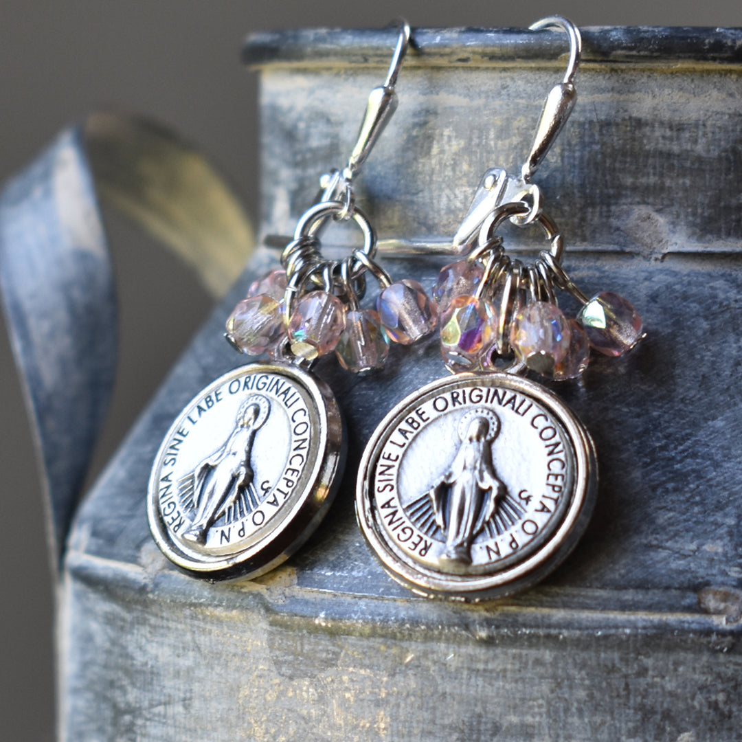 Attractive and traditional, these earrings feature rich, round Miraculous Medals with a simple, classy border. The Latin inscription, “Regina Sime Labe Originali Concepta OPN” appears on each medal, translating to, “Queen conceived without original sin, pray for us.” The Miraculous Medals are die-cast and silver oxidized in Italy with exceptional detail. Above each medal is a cluster of delicate, faceted, fire-polished light pink glass beads with an AB finish, adding a touch of color and beautiful, subtle sparkle as light hits each bead. These are such elegant earrings – perfect for everyday or can be dressed up – and a wonderful way to keep Our Blessed Mother with you throughout the day.