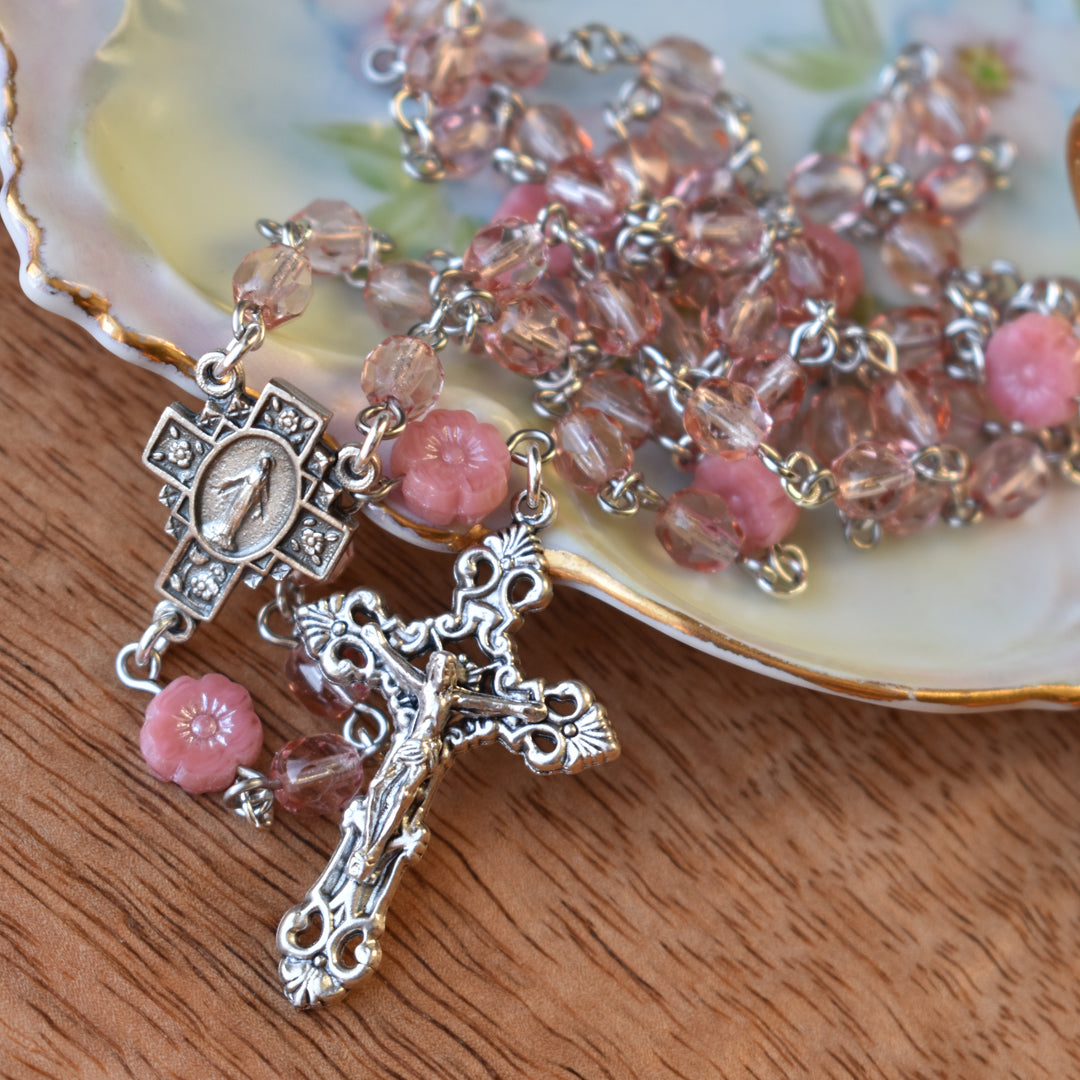 Pray the Rosary daily. Dainty and feminine this Rosary is designed around gorgeous floral Pater beads. From the Czech Republic, these beads are cut glass hibiscus flowers… opaque pink glass with a white luster finish. The Hail Mary beads coordinate beautifully… fire-polished and faceted Czech glass beads, soft pink and translucent, adding a light and delicate appearance. Their faceted surface allow for a subtle, yet lovely sparkle. Adding to the feminine appeal of this Rosary, is the centerpiece… an elegant, layered cross shape with sweet, floral details, all gracefully framing Mary at the center. The back side features the Marian Cross, the traditional symbol which appears on the back of the Miraculous Medal. Pairing perfectly is the crucifix, featuring refined, open scrollwork details and lovely flared edges. Both the centerpiece and crucifix are die-cast and silver oxidized in Italy.