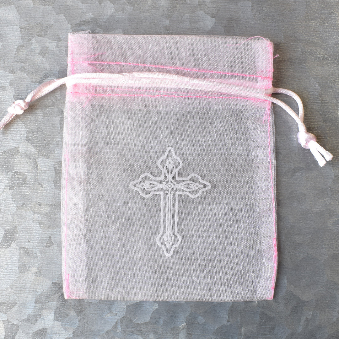 Keep your Rosary safe while carrying it to Mass and keeping it with you throughout the day. A perfect size for a pocket or a purse. This organza Rosary bag is stamped with a silver cross design and has a drawstring closure. A Rosary bag is a perfect addition to any rosary purchase adding a thoughtful, finishing touch.