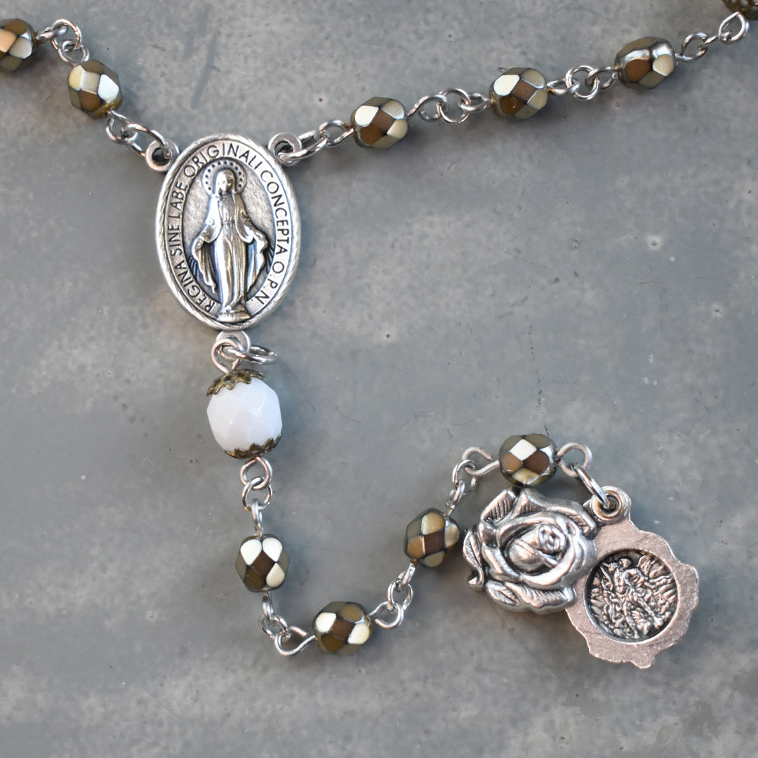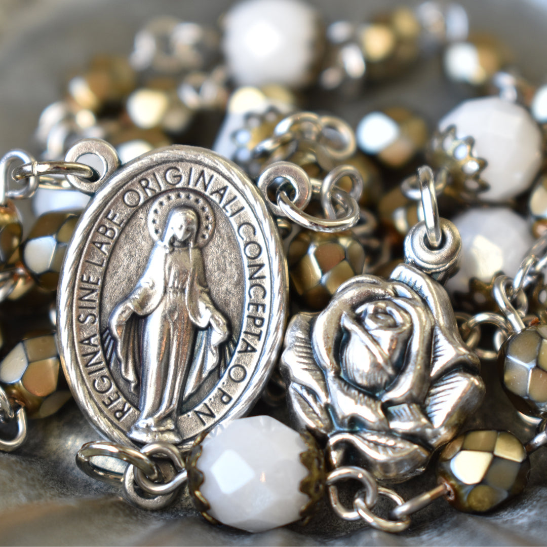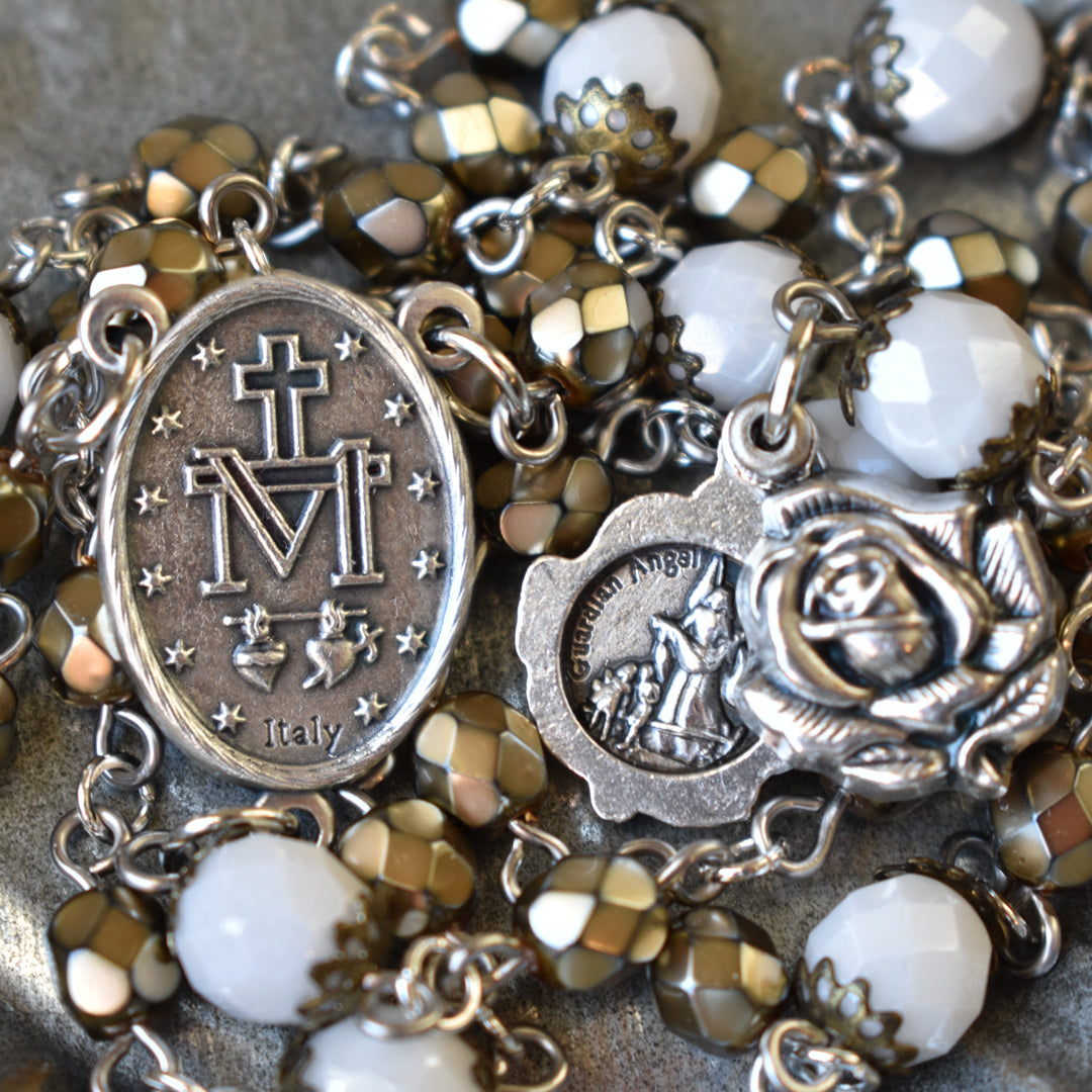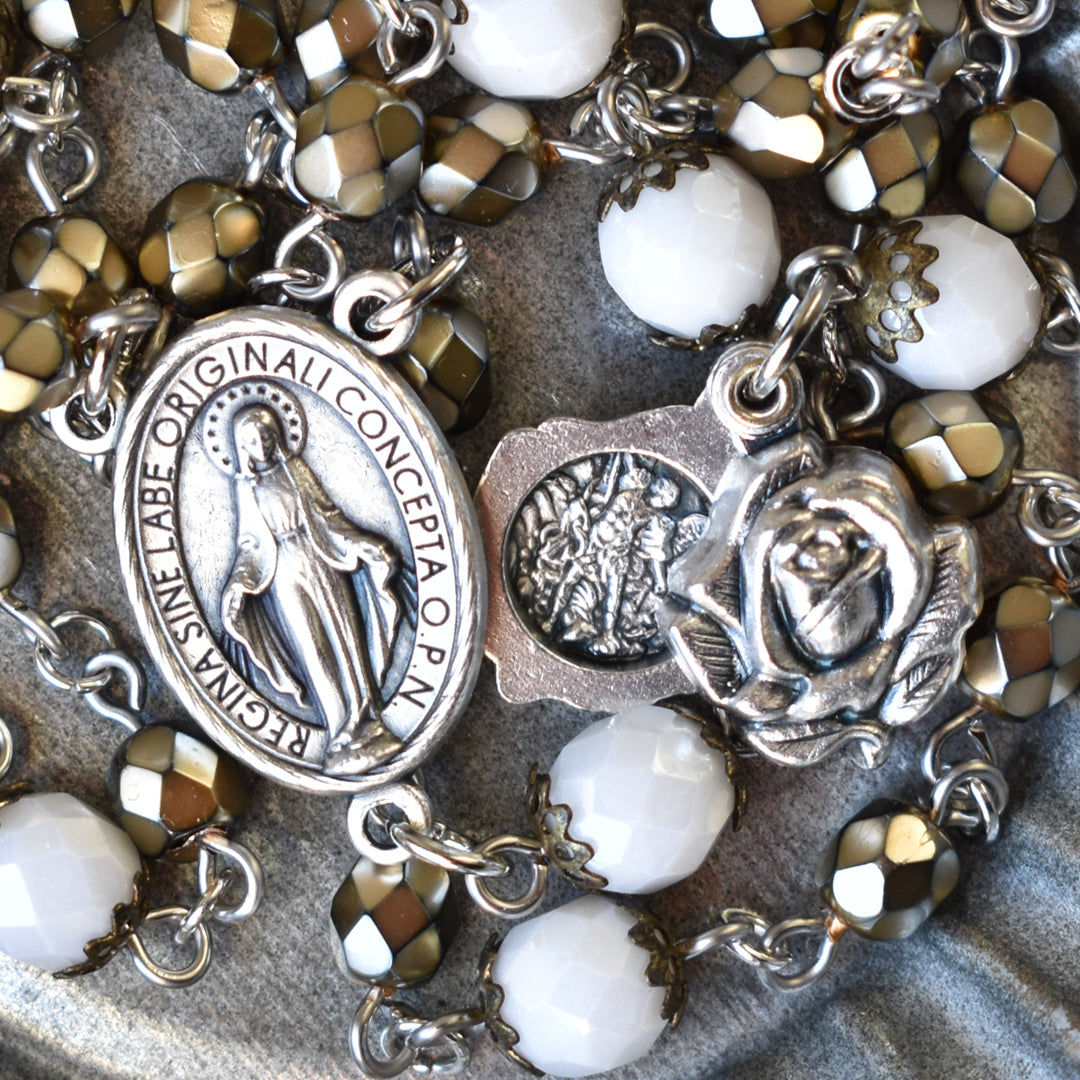 Sophisticated and so special, this Righteous & Regal St. Michael Chaplet was designed using high quality, fire-polished, faceted glass beads. The Hail Mary beads are smaller in size (6mm) and have a unique and gorgeous, golden, pearlized finish. I chose gold to symbolize the holy and heavenly presence of the angels and as a reminder of the glory and majesty of God. Gracefully contrasting the Hail Mary beads, are the alabaster white, faceted glass beads with a subtle, luster finish. Delicately detailed vintage bronze bead caps add a touch of warmth and heirloom quality to the Our Father beads. White was specifically chosen to serve as a symbol of the purity, holiness, virtue and reverence of the angels. A traditional Miraculous Medal centerpiece features in Latin, “Regina Sine Labe Originali Concepta O.P.N.” The O.P.N. at the end stands for “ora pro nobis.” The Latin to English translation is, “Queen conceived without original sin, pray for us.” Making this Chaplet especially unique and special, is the rose shaped locket revealing St. Michael and a guardian angel when opened. Both the centerpiece and locket are made in Italy with exceptional detail.