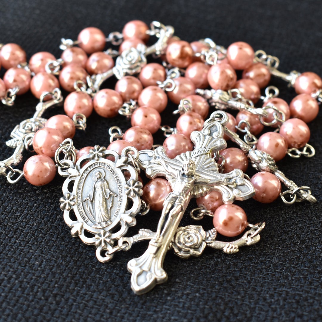 Pray the Rosary daily. The rose is such an iconic symbol associated with our Heavenly Mother and one which I love to incorporate into my Rosary designs. The story of Pierina Gilli and the accounts of the Marian apparitions she experienced are truly phenomenal. It is from her story and the Litany of Loreto which inspired the name of this Rosary… Rosa Mystica. The Our Father beads are beautiful thornless roses, die-cast and silver oxidized in Italy. The thornless rose is representative of Mary’s pure and sinless soul. The Hail Mary beads are gorgeous, fire-polished, Czech pink glass beads speckled with flecks of brown, giving these beads a subdued, rich rose color. Both the centerpiece and crucifix are die-cast and silver oxidized in Italy. The centerpiece is traditional, featuring the Miraculous Medal with gorgeous, feminine floral details and a scalloped edge. The crucifix features exquisite details of flared edges, scrolls and a beautiful sunburst effect behind the crossbeams.