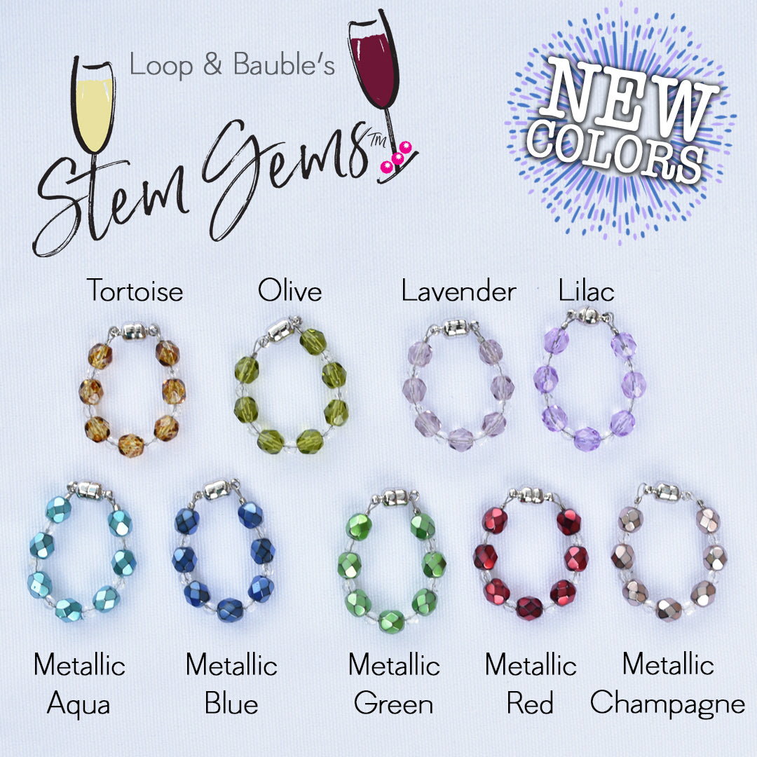 Never mix up your wine glasses again! With Loop & Bauble’s Stem Gems™ you can easily attach a wine glass marker so you will always know “which wine is mine!” Each wine glass marker is designed with beautiful, fire-polished, faceted glass beads in a different color. The faceted beads catch the light for a lovely sparkle. Made with magnetic clasps, Stem Gem wine glass markers secure around the stem of a wine glass quickly and easily, with no wire that can bend out of shape! Adorably packaged and with an organza storage bag included, Stem Gems make the perfect gift for any wine lover!