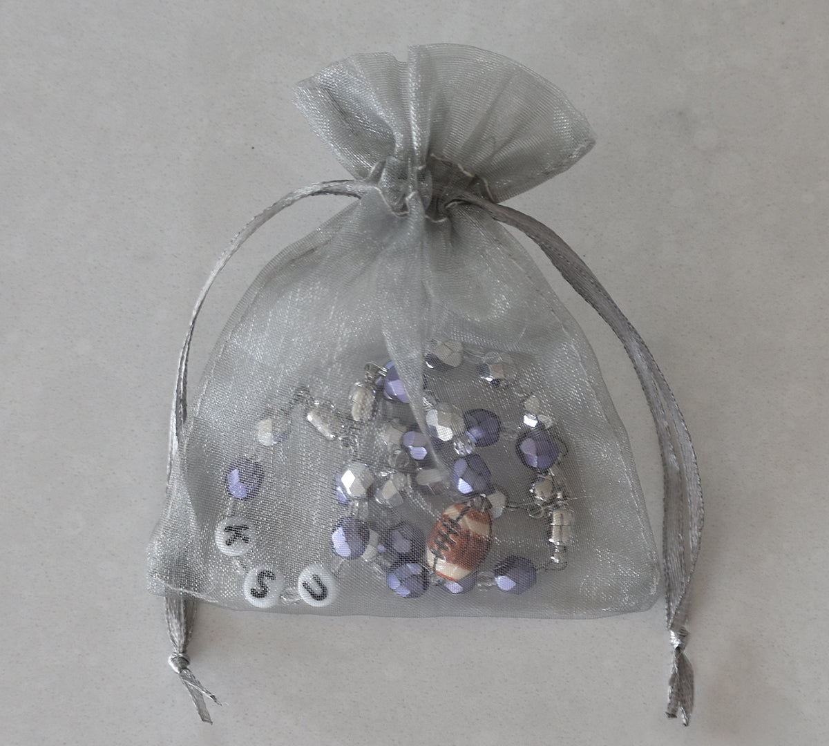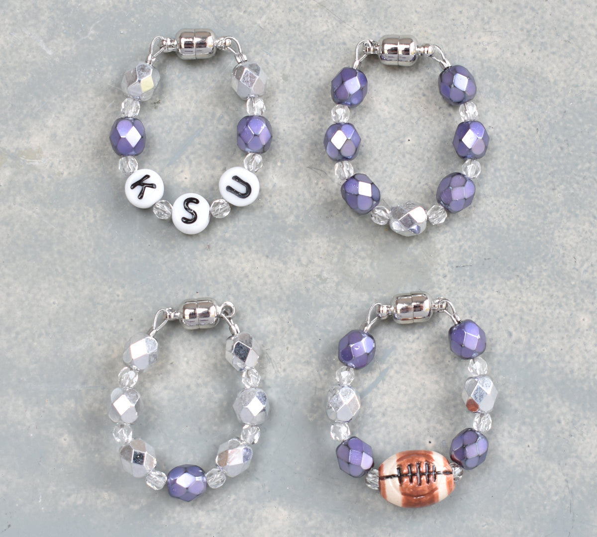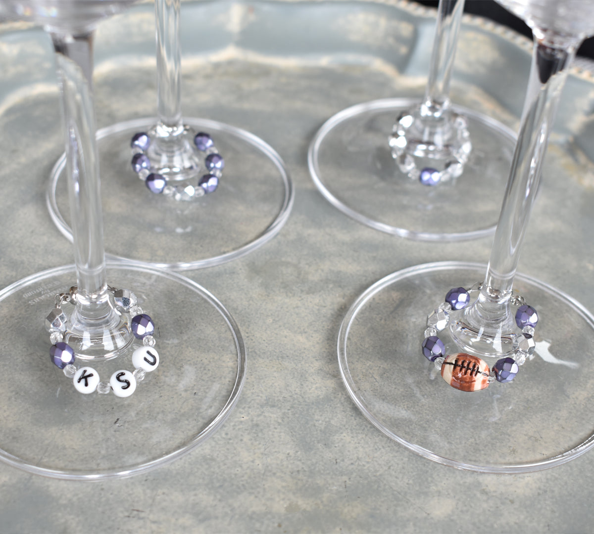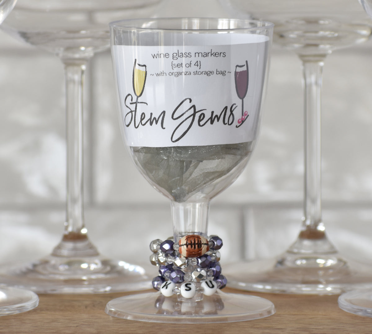 Keep the wine flowing and cheer on the Wildcats with Loop & Bauble’s KSU Stem Gems™! Designed with love and quality materials, this set features porcelain “KSU” beads, a hand-painted, ceramic football bead, and beautiful, fire-polished, faceted glass beads in the team colors of purple and silver.