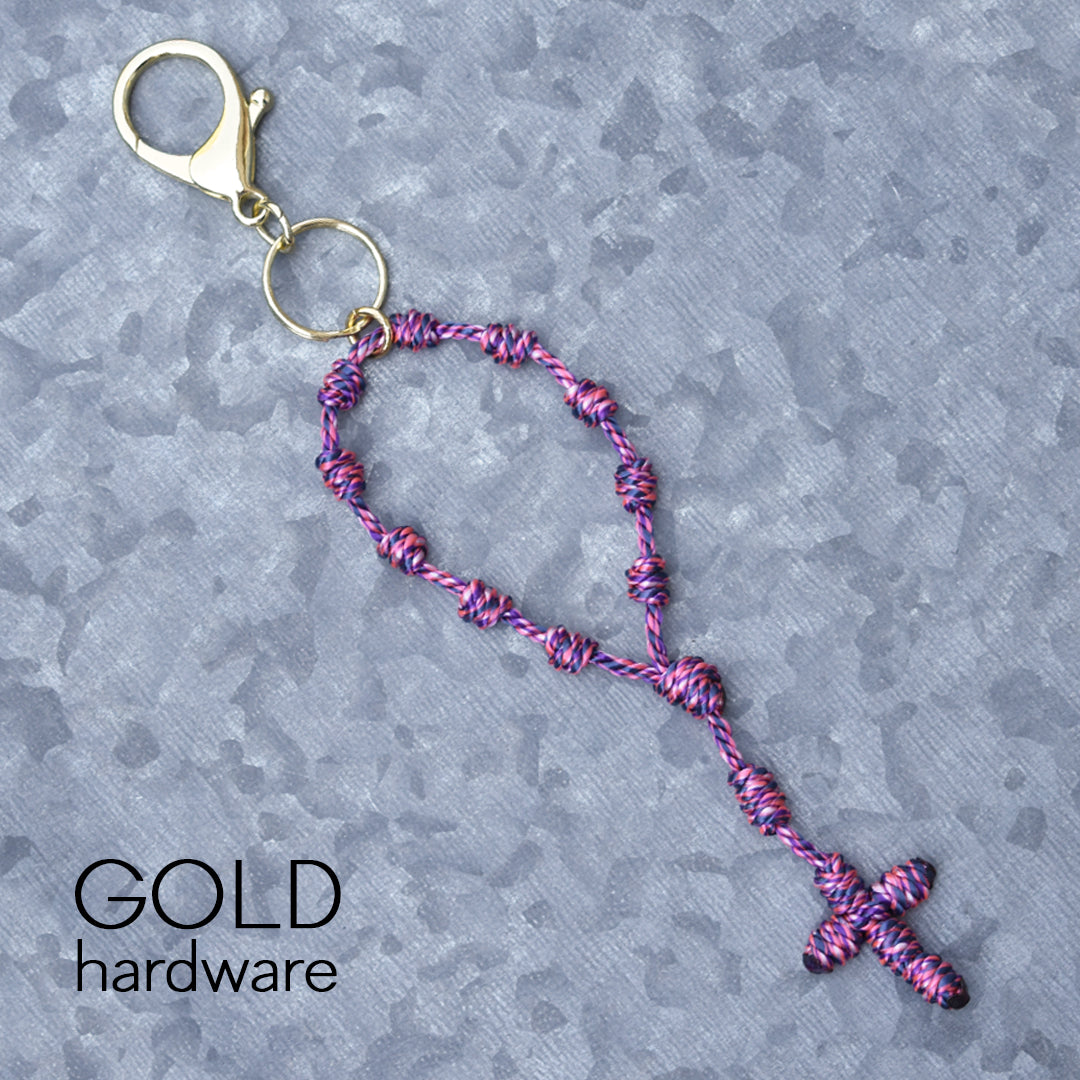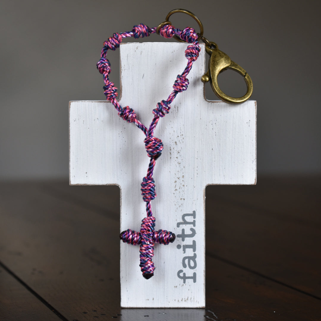 This Wandering Rosary™ is made completely out of high-quality, 3-strand twisted twine. Each knot is tied by hand to form the Hail Mary beads, Our Father bead, Centerpiece and Cross. An oversized lobster clasp keyring allows the Wandering Rosary™ to be used in a variety of ways. Clip one to a backpack, purse, tote bag, gym bag, luggage, or use it as a keychain.