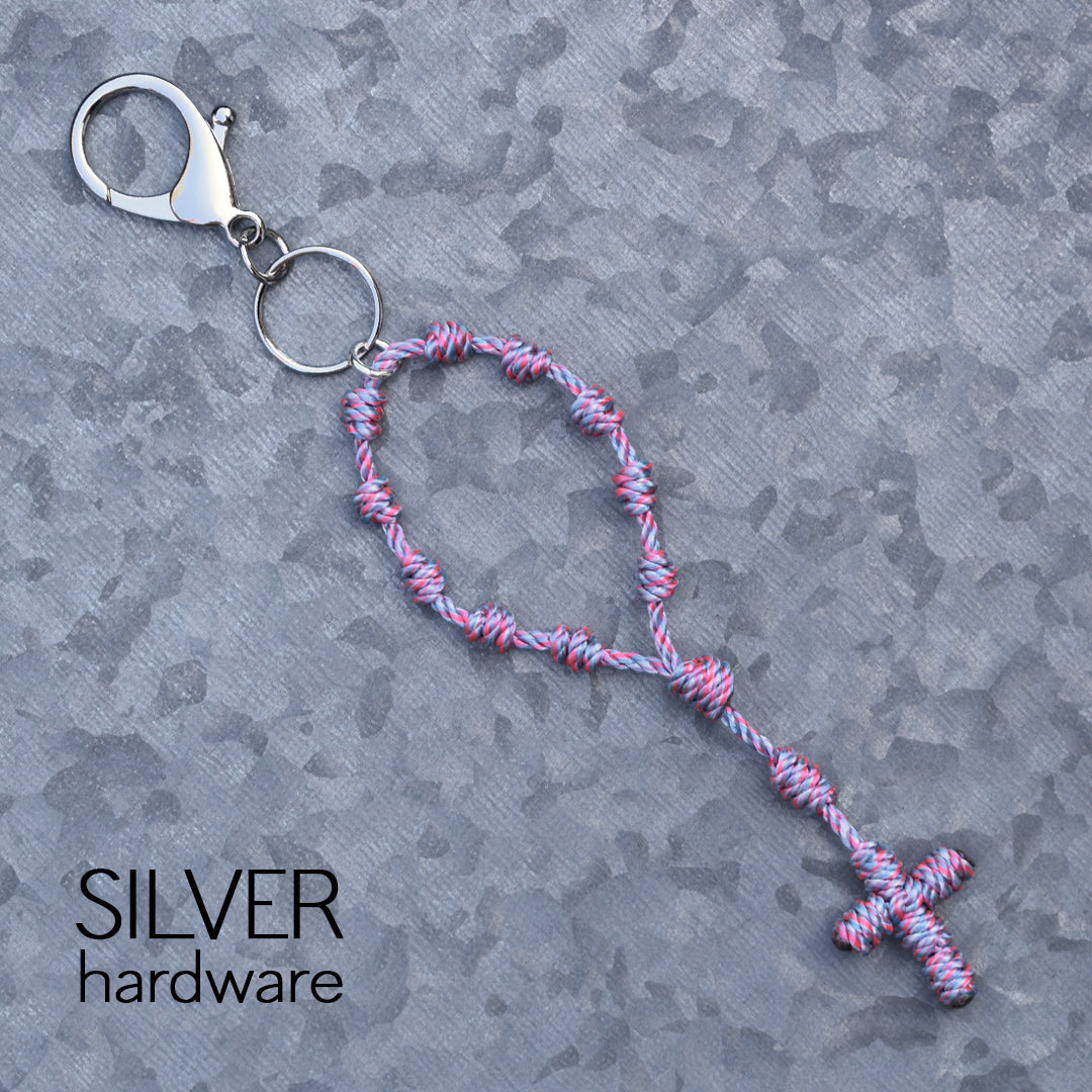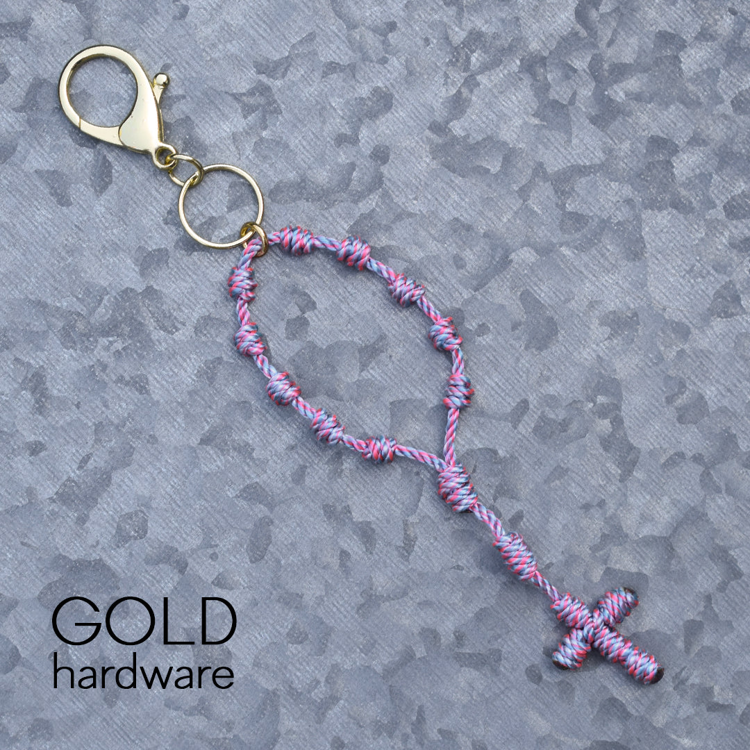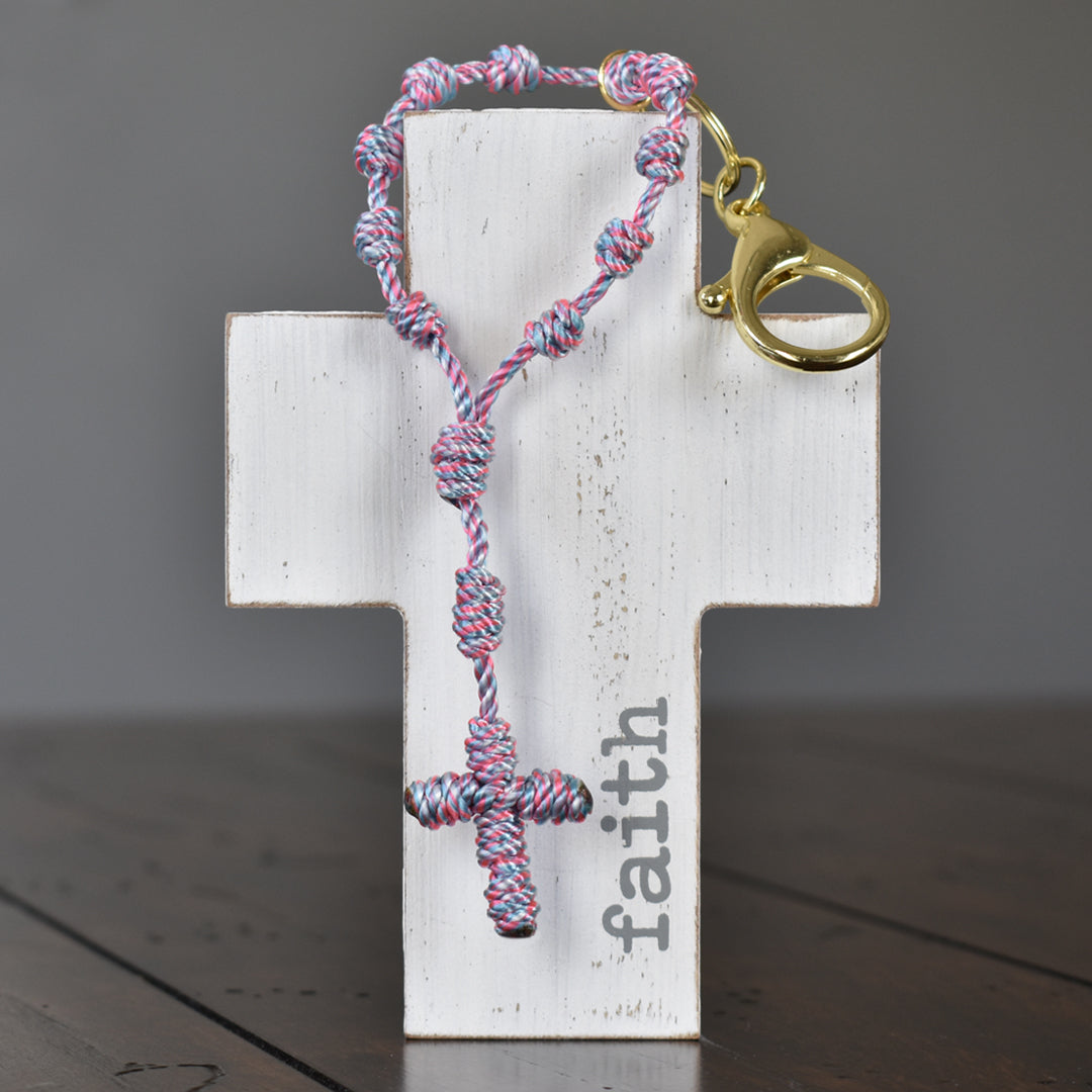 This Wandering Rosary™ is made completely out of high-quality, 3-strand twisted twine. Each knot is tied by hand to form the Hail Mary beads, Our Father bead, Centerpiece and Cross. An oversized lobster clasp keyring allows the Wandering Rosary™ to be used in a variety of ways. Clip one to a backpack, purse, tote bag, gym bag, luggage, or use it as a keychain.