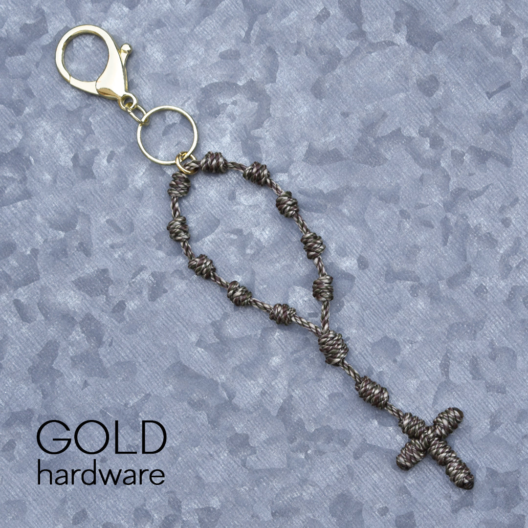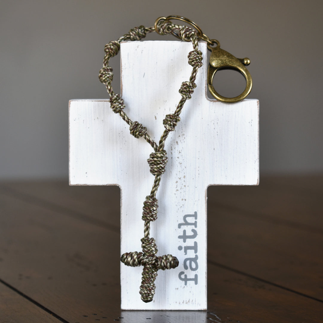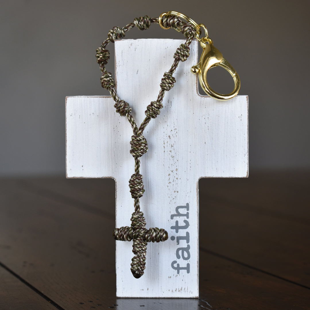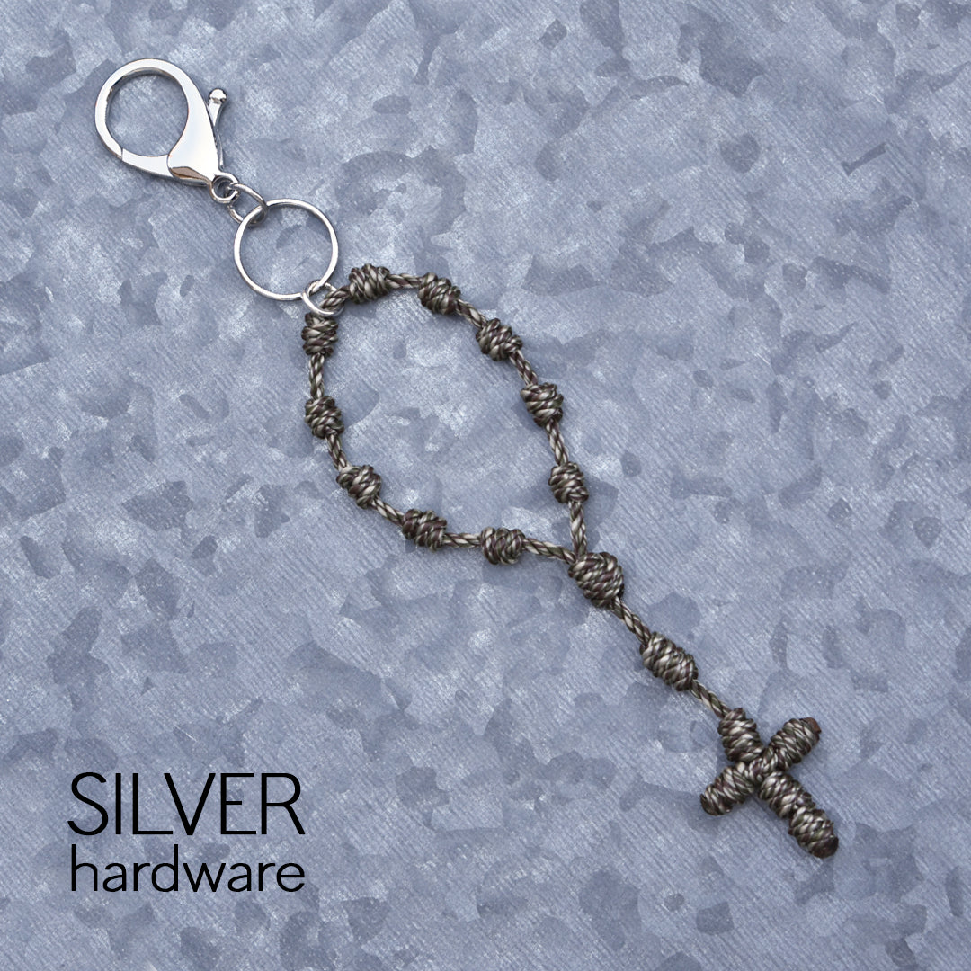 This Wandering Rosary™ is made completely out of high-quality, 3-strand twisted twine. Each knot is tied by hand to form the Hail Mary beads, Our Father bead, Centerpiece and Cross. An oversized lobster clasp keyring allows the Wandering Rosary™ to be used in a variety of ways. Clip one to a backpack, purse, tote bag, gym bag, luggage, or use it as a keychain.