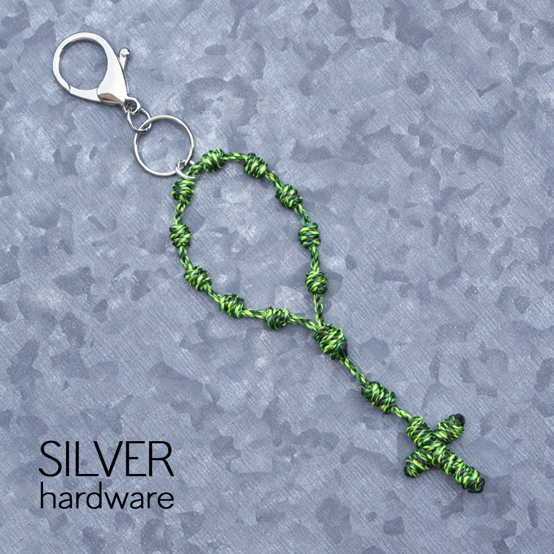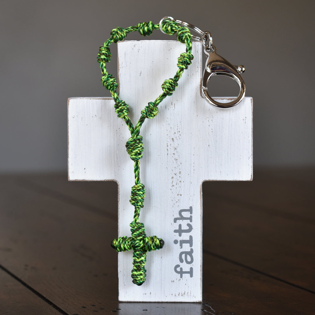 This Wandering Rosary™ is made completely out of high-quality, 3-strand twisted twine. Each knot is tied by hand to form the Hail Mary beads, Our Father bead, Centerpiece and Cross. An oversized lobster clasp keyring allows the Wandering Rosary™ to be used in a variety of ways. Clip one to a backpack, purse, tote bag, gym bag, luggage, or use it as a keychain.