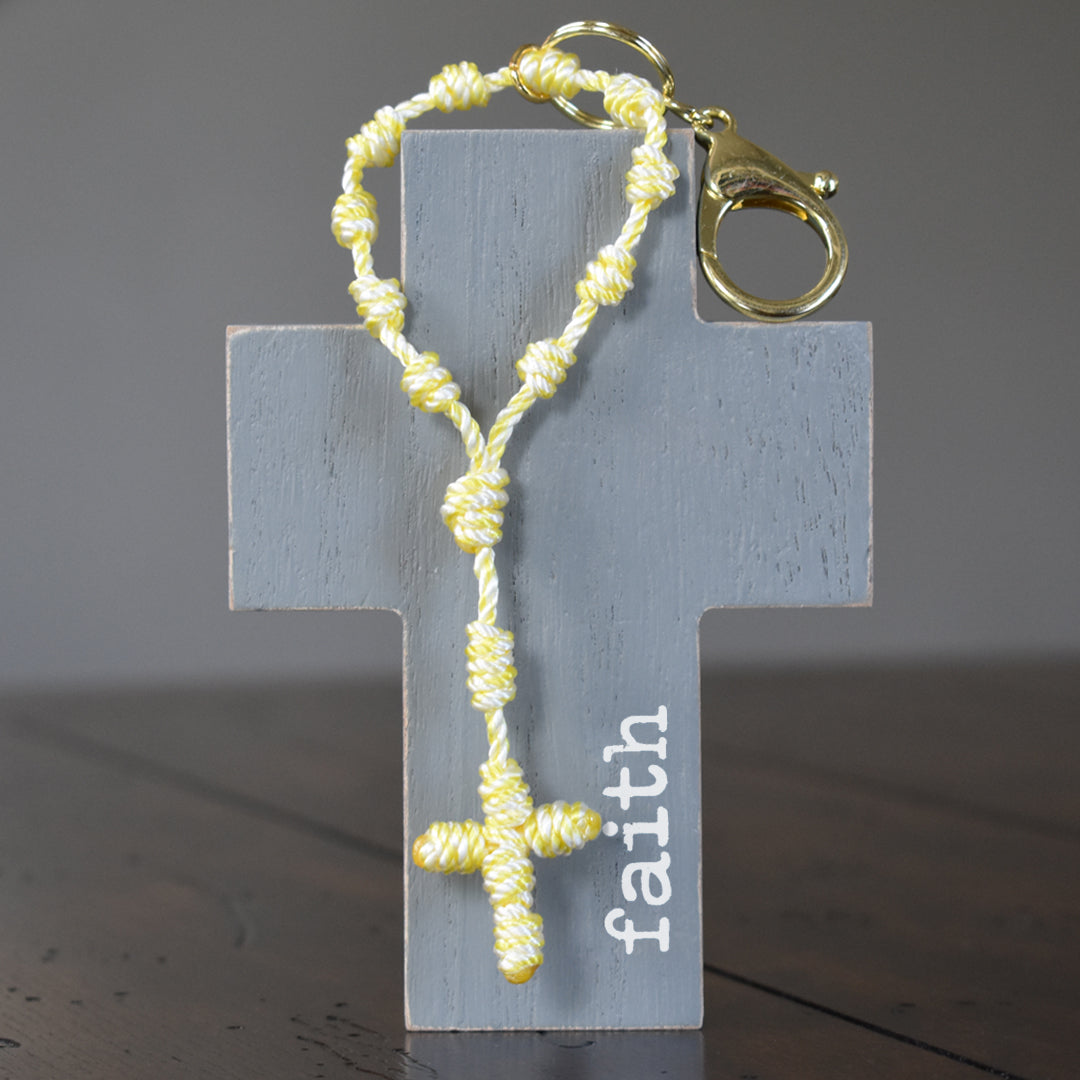 This Wandering Rosary™ is made completely out of high-quality, 3-strand twisted twine. Each knot is tied by hand to form the Hail Mary beads, Our Father bead, Centerpiece and Cross. An oversized lobster clasp keyring allows the Wandering Rosary™ to be used in a variety of ways. Clip one to a backpack, purse, tote bag, gym bag, luggage, or use it as a keychain.
