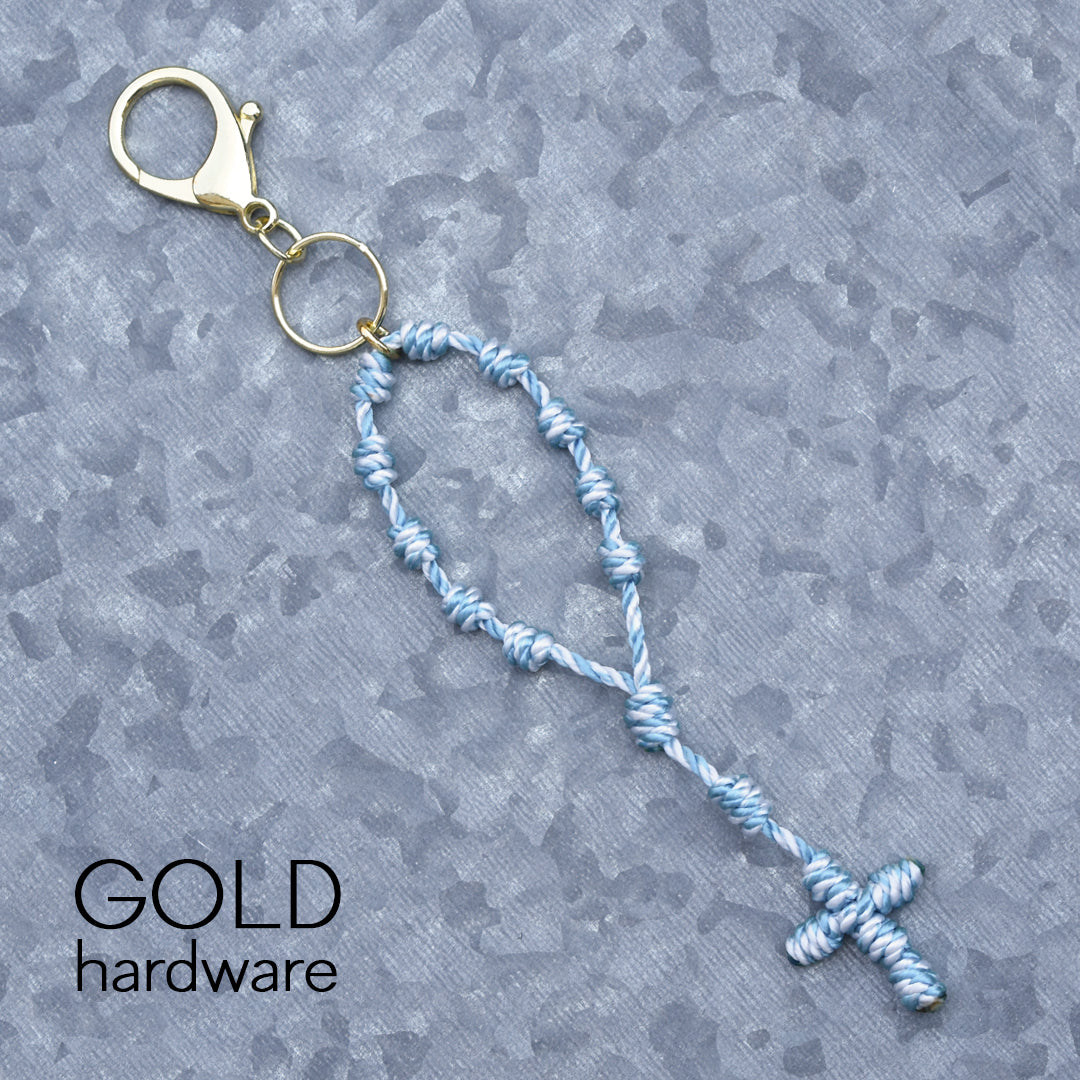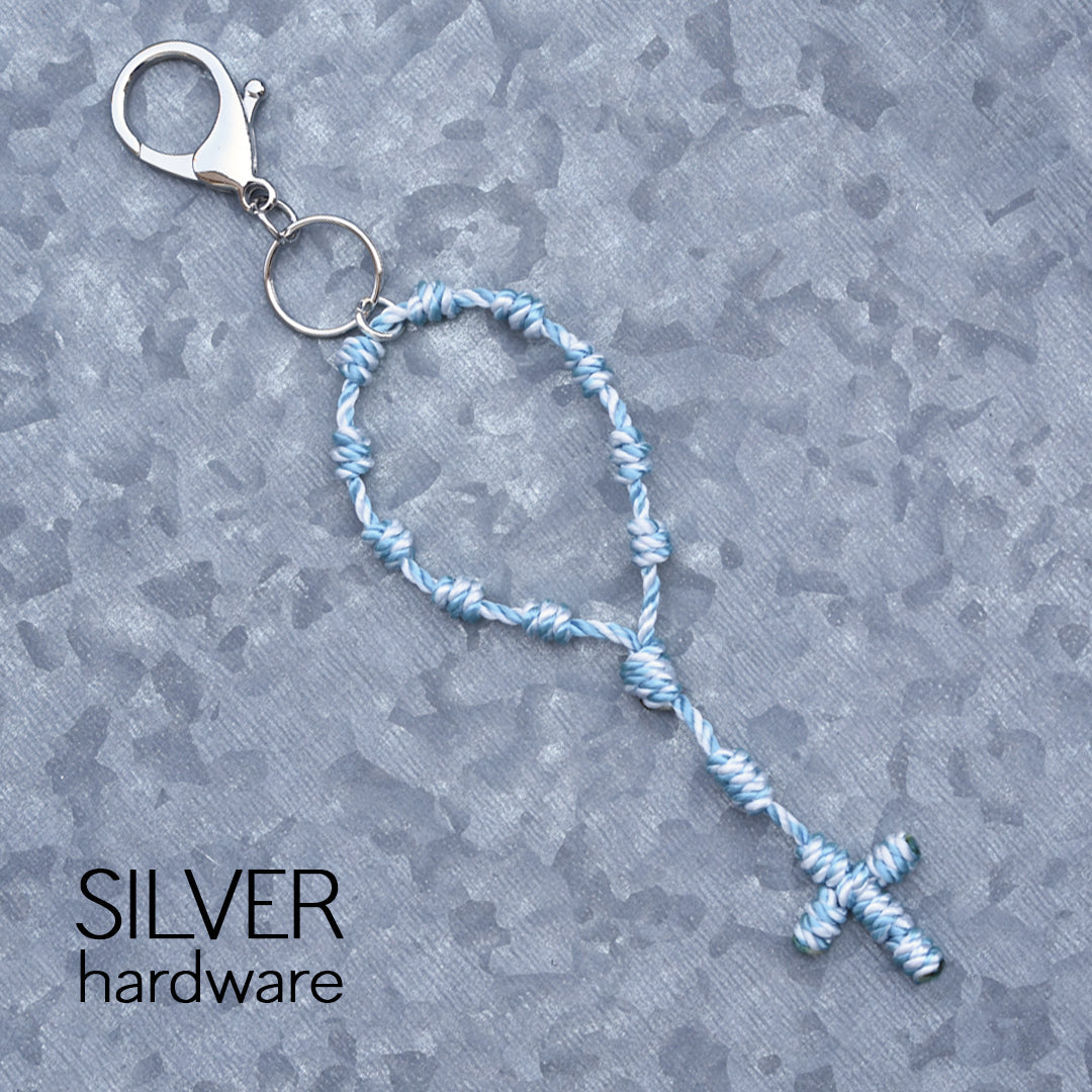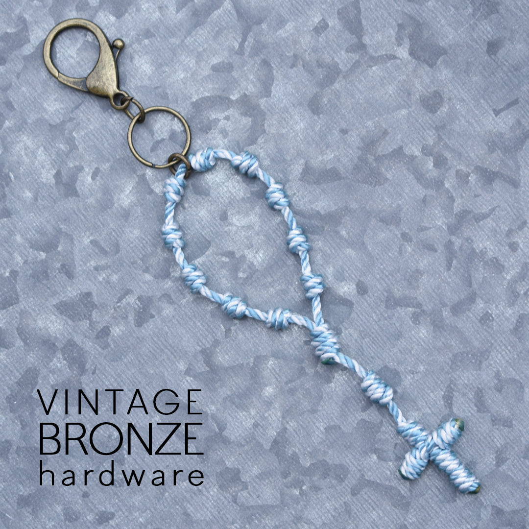 This Wandering Rosary™ is made completely out of high-quality, 3-strand twisted twine. Each knot is tied by hand to form the Hail Mary beads, Our Father bead, Centerpiece and Cross. An oversized lobster clasp keyring allows the Wandering Rosary™ to be used in a variety of ways. Clip one to a backpack, purse, tote bag, gym bag, luggage, or use it as a keychain.