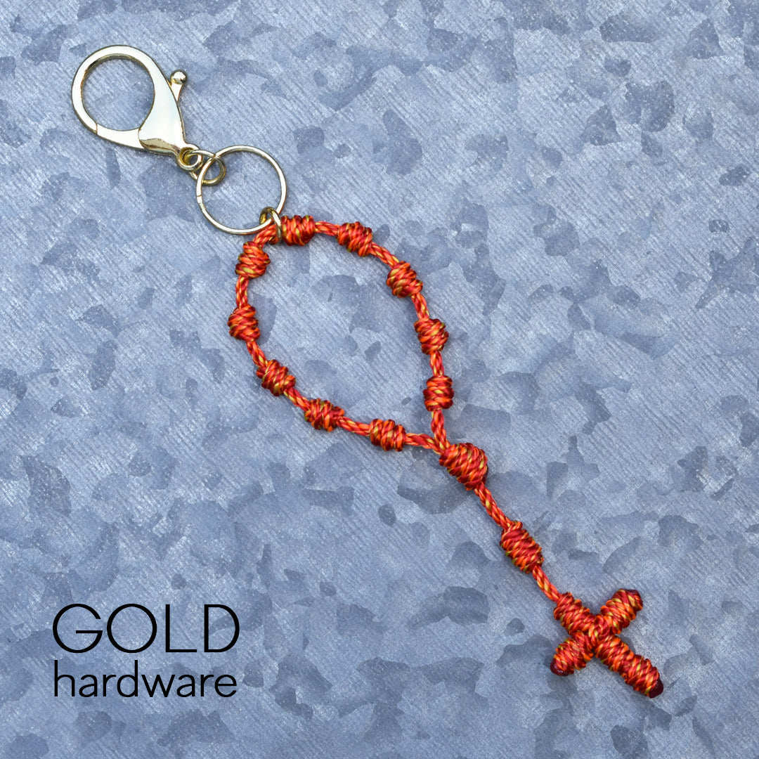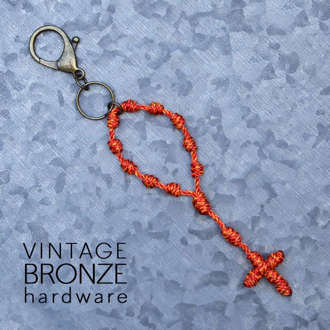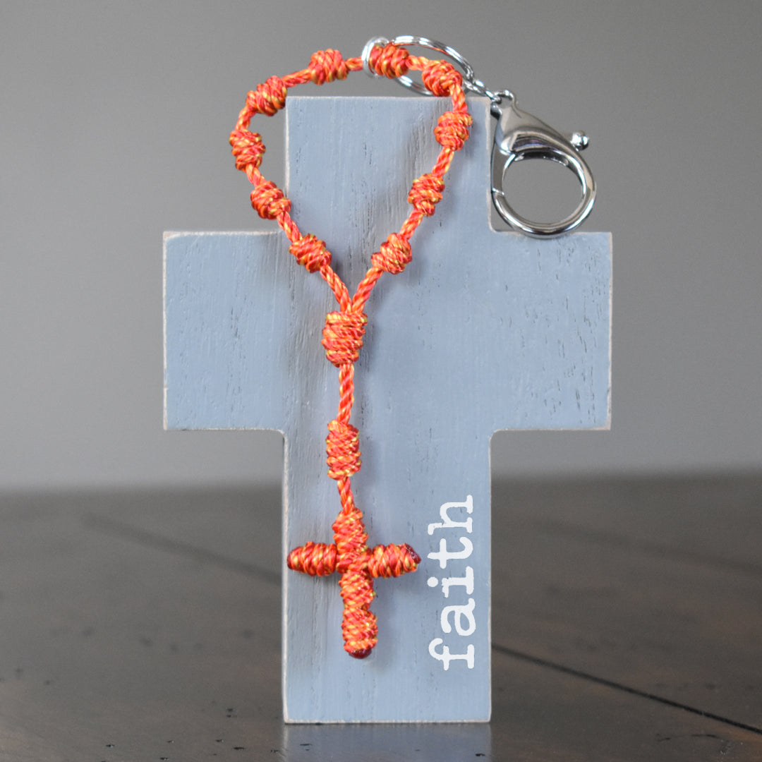 This Wandering Rosary™ is made completely out of high-quality, 3-strand twisted twine. Each knot is tied by hand to form the Hail Mary beads, Our Father bead, Centerpiece and Cross. An oversized lobster clasp keyring allows the Wandering Rosary™ to be used in a variety of ways. Clip one to a backpack, purse, tote bag, gym bag, luggage, or use it as a keychain.