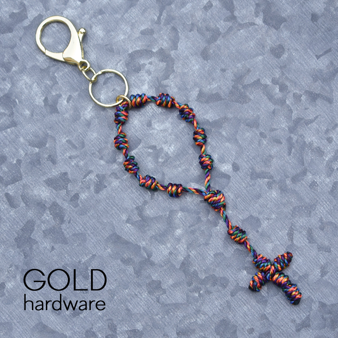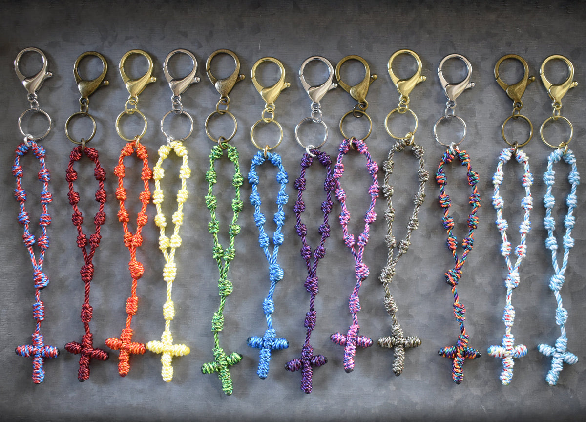 This Wandering Rosary™ is made completely out of high-quality, 3-strand twisted twine. Each knot is tied by hand to form the Hail Mary beads, Our Father bead, Centerpiece and Cross. An oversized lobster clasp keyring allows the Wandering Rosary™ to be used in a variety of ways. Clip one to a backpack, purse, tote bag, gym bag, luggage, or use it as a keychain.